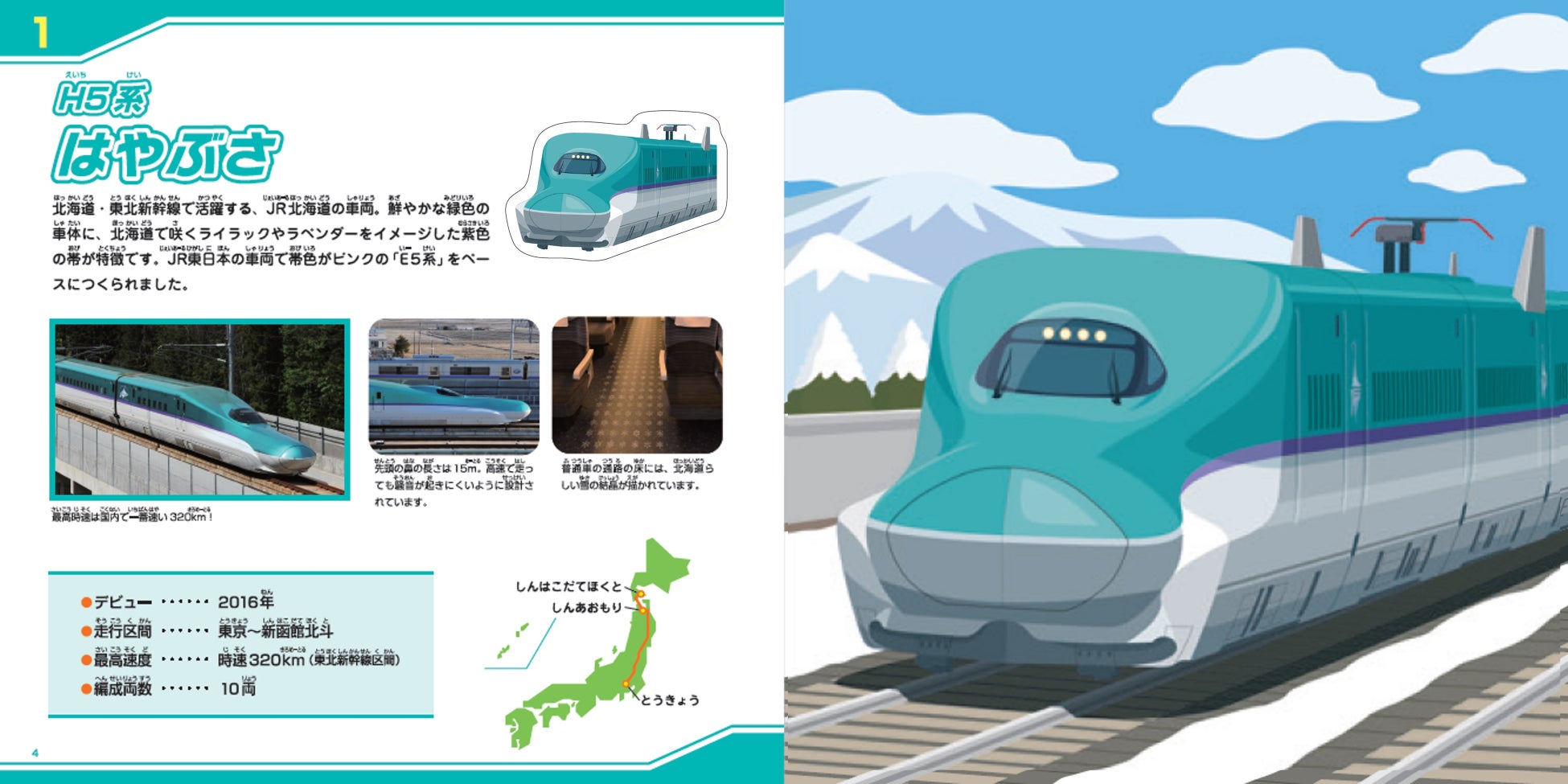 各ページでは、それぞれの新幹線・乗り物について、活躍している様子を写真と文章で紹介。パズルをクリアした後は「自分で完成させた図鑑」としてお楽しみいただけます。漢字とアルファベットにルビ(ふりがな)を振り、読みやすくしました。
