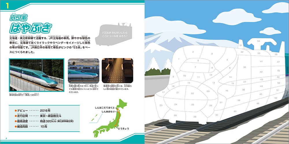 シールを貼る台紙ページと、新幹線・乗り物の紹介文、活躍している区間・場所などを掲載したページが見開きになっており、パズルを終えた後は図鑑として楽しめる仕様にしました。