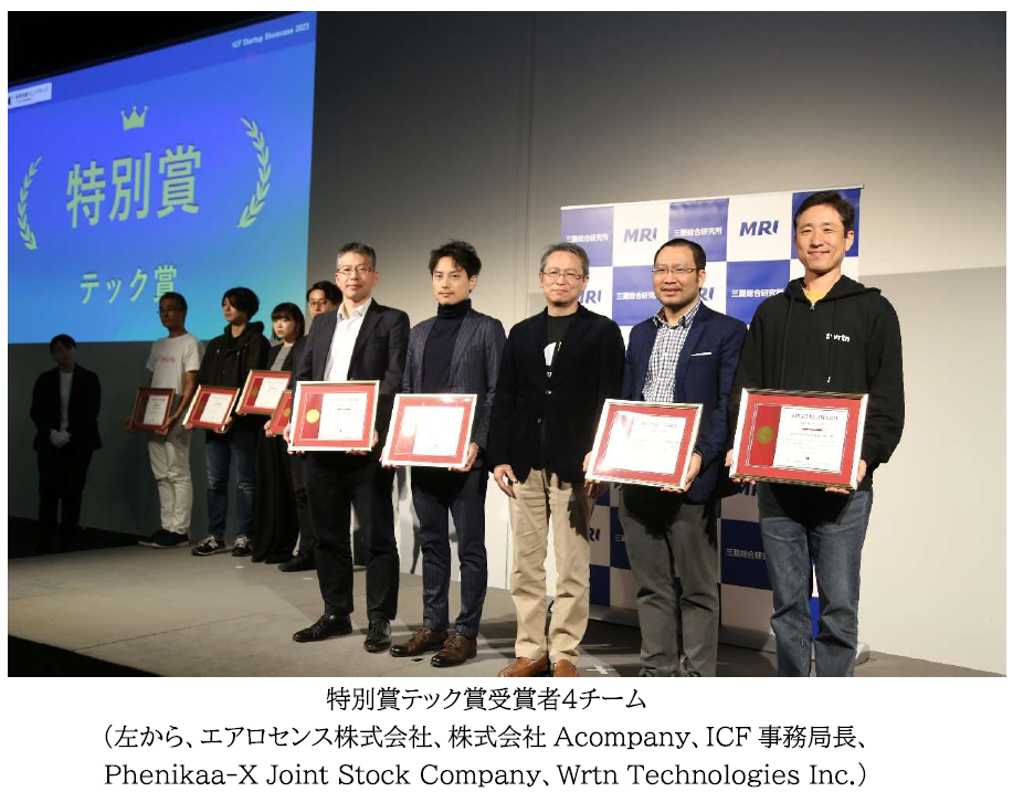 12月8日に行われたICF Startup Showcase 2023では、ファイナリストピッチ、特別賞受賞者ピッチ、ファイナリストを対象とした最終審査会を実施しました。最終審査会では、ICFアドバイザーを含む有識者5名および当社審査員による厳正な審査の結果、以下のとおり各受賞者を決定しました。