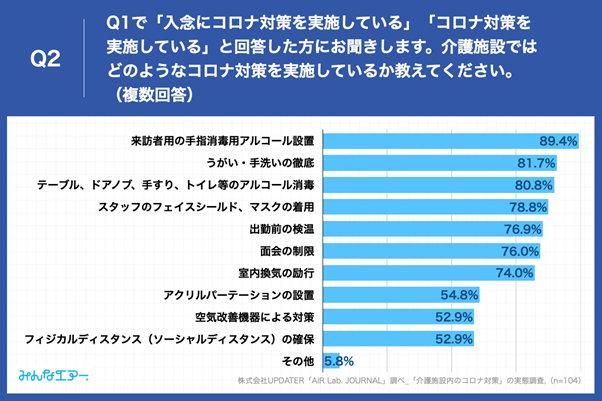 「Q2.Q1で「入念にコロナ対策を実施している」「コロナ対策を実施している」と回答した方にお聞きします。介護施設ではどのようなコロナ対策を実施しているか教えてください。(複数回答)」(n=104)と質問したところ、「来訪者用の手指消毒用アルコール設置」が89.4%、「うがい・手洗いの徹底」が81.7%、「テーブル、ドアノブ、手すり、トイレ等のアルコール消毒」が80.8%、「空気改善機器による対策」52.9%という回答となりました。