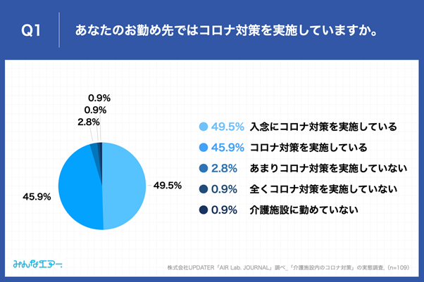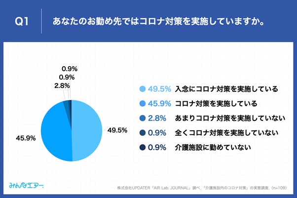 「顔の見えるライフスタイル」の実現を目指す株式会社UPDATER(所在地:東京都世田谷区、代表取締役:大石英司)のエアテック事業「みんなエアー」(https://minnaair.com/)は、介護施設従事者109名を対象に、「介護施設内のコロナ対策」の実態調査を実施しました。