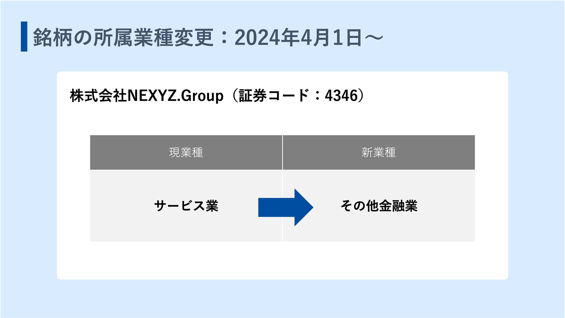 株式会社NEXYZ.Group(本社:東京都渋谷区 代表取締役社長 近藤太香巳 証券コード:4346)は、2002年の株式上場以降「サービス業」に分類されておりましたが、証券コード協議会の決定により、本年4月1日より「その他金融業」に変更されることになりましたので、お知らせいたします。