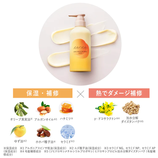 ※保湿・エモリエント・ヘアコンディショニング成分の合計、水を含む(ラフラ アロマセラムトリートメント モイストのこと) *香りによる心地良い美容のこと *1富士経済レポート(2025年7月23日 第25074号)より *2乾燥によるパサつきやダメージのこと *3「ラフラ アロマセラムシャンプー モイスト」のこと *4香りの心地良さのこと