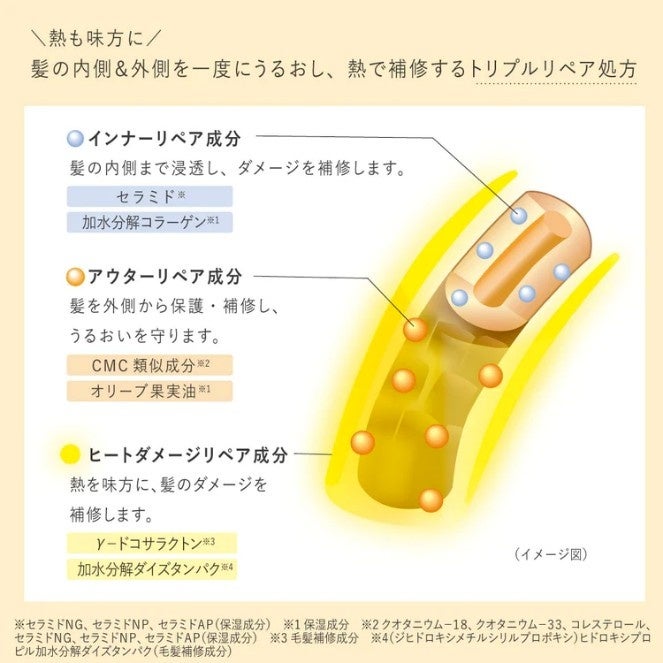 髪の内側&外側を一度にうるおし、熱で補修するトリプルリペア処方