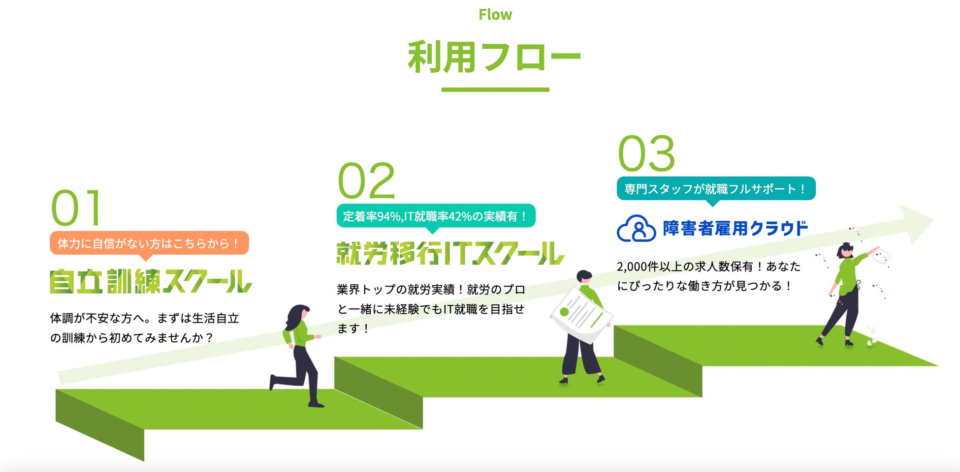 当社は、全国40拠点以上で障害福祉サービスを運営してきた実績とノウハウを活かし、包括的な支援体制を提供します。体調や生活面のサポートを中心に行う「自立訓練スクール」から、就職と職場定着を支援する「就労移行ITスクール」、障害者雇用での就職サポートを行う「障害者雇用クラウド」まで、ご利用者様の「実現したい未来」に寄り添い、一貫して伴走します。