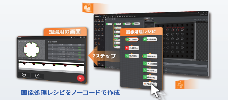 ImageProは、ノーコード開発で画像処理検査プログラムを作成できるソフトウェアです。C++やPython等のプログラミング言語を使用して開発をすることなく、マウスのドラッグ&ドロップ操作によって、ルールベースのAIで構成する検査・解析プログラムを視覚的に設計できるため、開発工数を大幅に削減します。開発された検査・解析プログラムは、カメラで撮像した対象ワーク画像に適用することで、検査処理が実行されます。良品画像のみで学習・実装可能な「異常検知」や「コード&文字読取り」等もご活用いただけます。