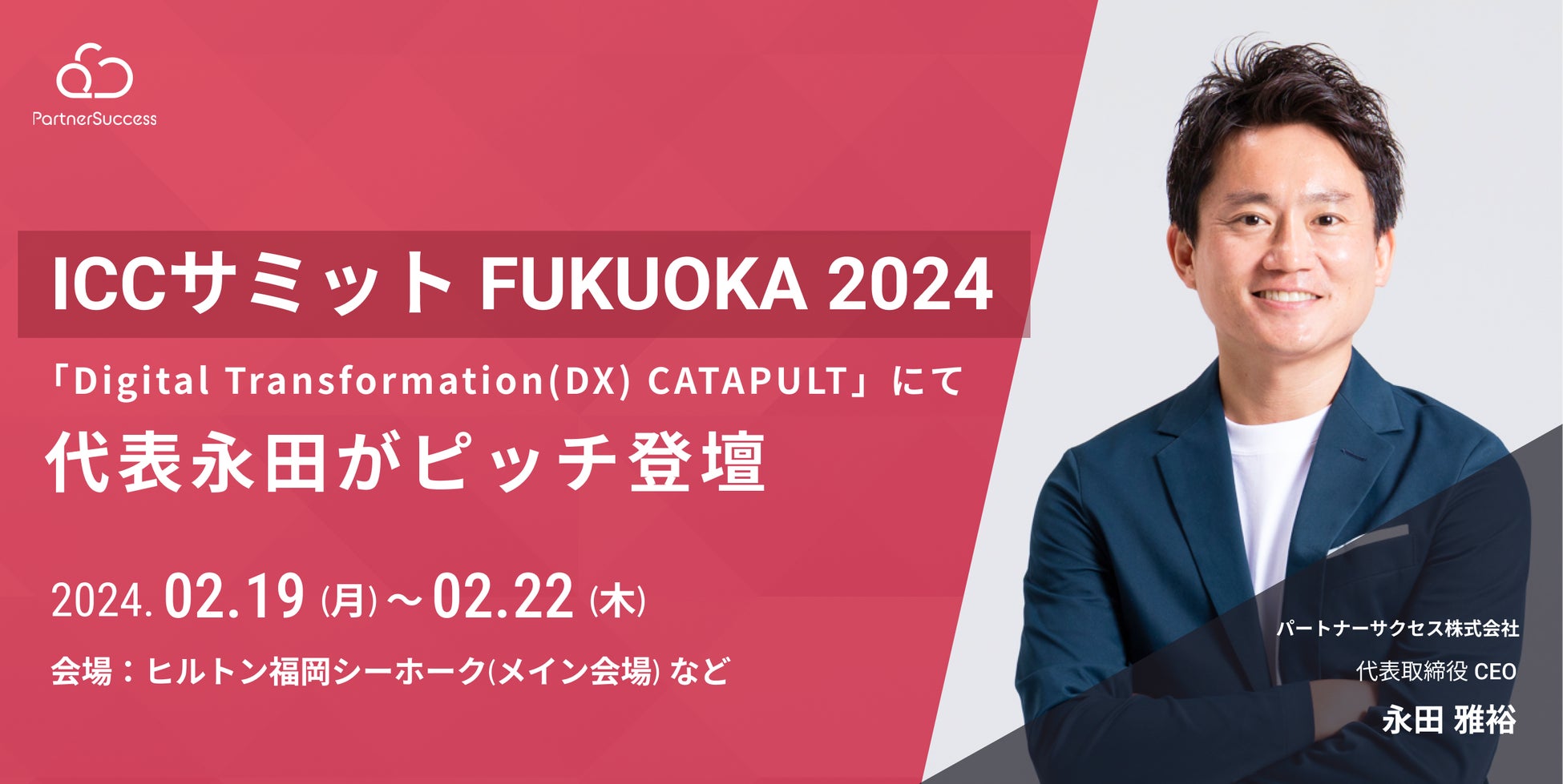 代理店販売で業績を伸ばすPRM(※1)-代理店連携管理クラウド「PartnerSuccess」を開発運営するパートナーサクセス株式会社(本社:東京都港区、代表取締役 永田雅裕、以下「パートナーサクセス」)は、2024年2月19日(月)〜2月22日(木)に福岡で開催される「ICCサミット FUKUOKA 2024」に登壇いたします。