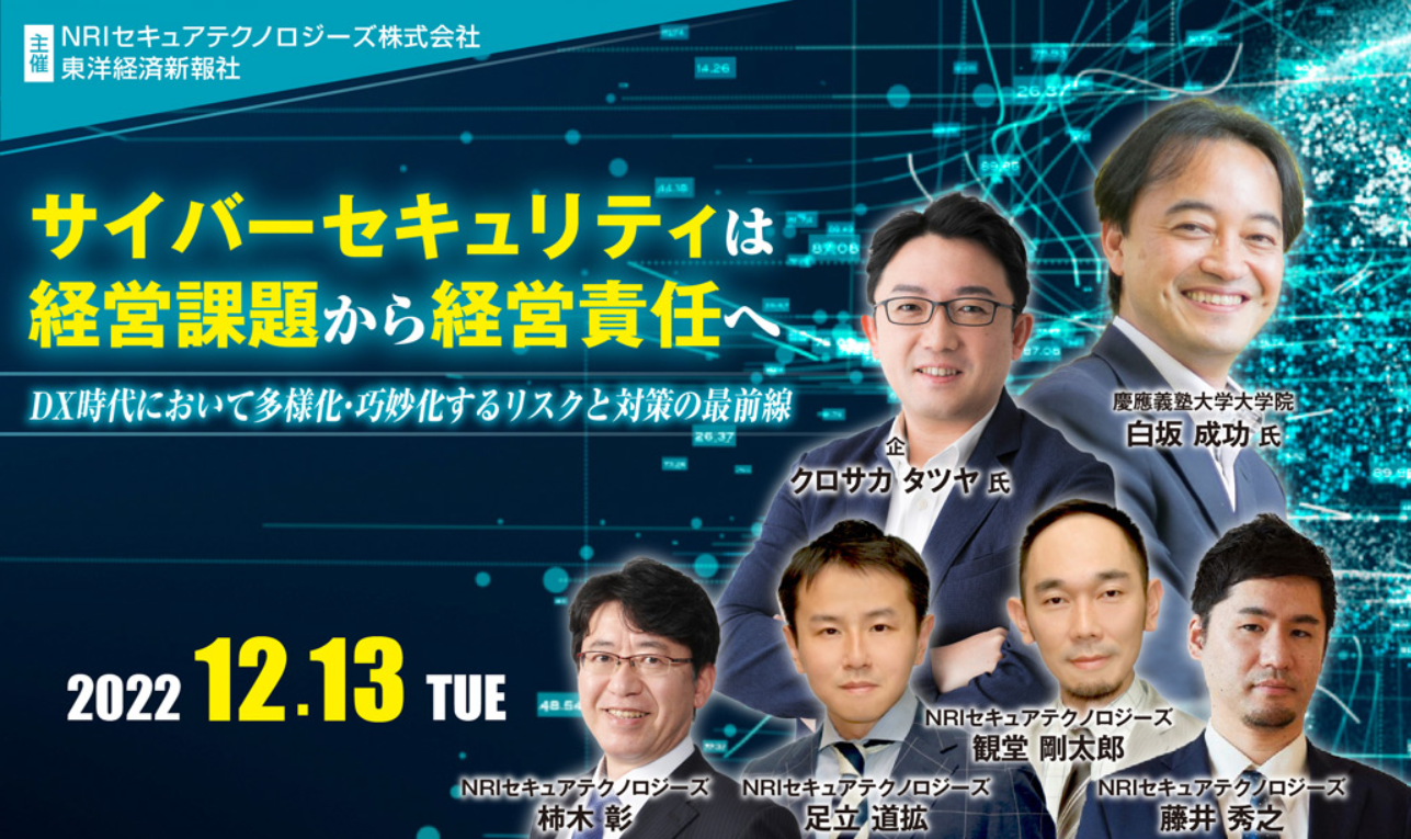 NRIセキュアテクノロジーズ株式会社(以下「NRIセキュア」)は、2022年12月13日に、「サイバーセキュリティは経営課題から経営責任へ ~DX時代において多様化・巧妙化するリスクと対策の最前線~」と題した無料のオンラインカンファレンスを、株式会社東洋経済新報社と共同で開催します。