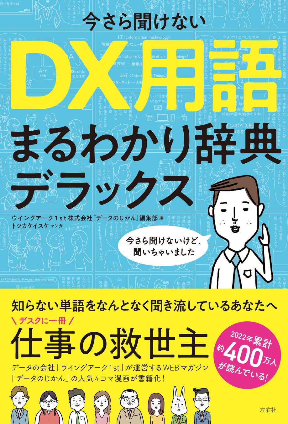 この度、株式会社左右社では『今さら聞けない DX⽤語まるわかり辞典デラックス』(ウイングアーク1st株式会社「データのじかん」編集部編/トツカケイスケ漫画)を2023年4⽉5⽇に刊⾏いたします。リスキリングに関⼼が⾼まるいま、現場で働く社員個⼈に役⽴つ本として、難しいDX⽤語をわかりやすく4コマ漫画で解説した⼀冊です。ぜひ本書の取材やご紹介をご検討ください。何卒よろしくお願い申し上げます。