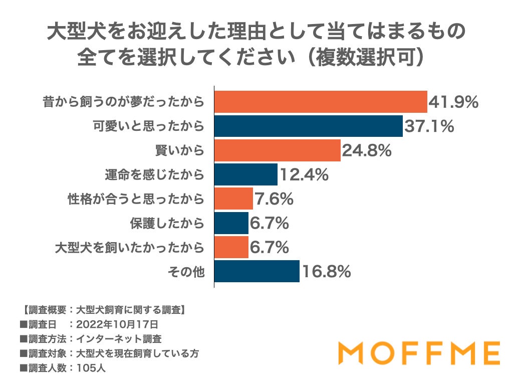 「昔から飼うのが夢だったから」が41.9%、「可愛いと思ったから」が37.1%、「賢いから」が24.8%、「運命を感じたから」が24.8%と続く結果となりました。