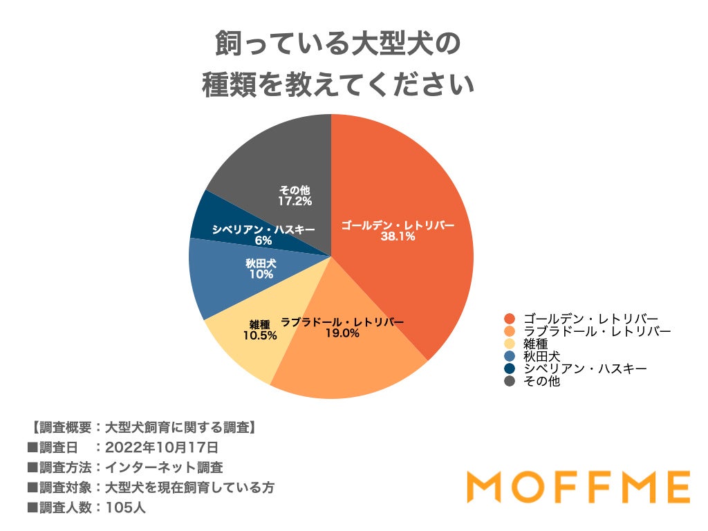 「ゴールデン・レトリバー」が38.1%、「ラブラドール・レトリバー」が19%、「雑種」が10.5%、「秋田犬」が10%、「シベリアン・ハスキー」「ジャーマン・シェパード・ドッグ」が同率の6%という結果という結果となりました。