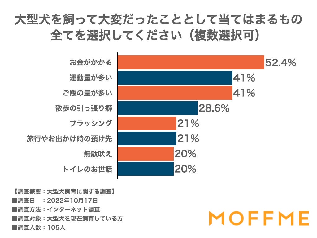 「お金がかかる」が52.4%、「運動量が多い」「ご飯の量が多い」が同率の41%、「散歩の引っ張り癖」が28.6%と続きました。