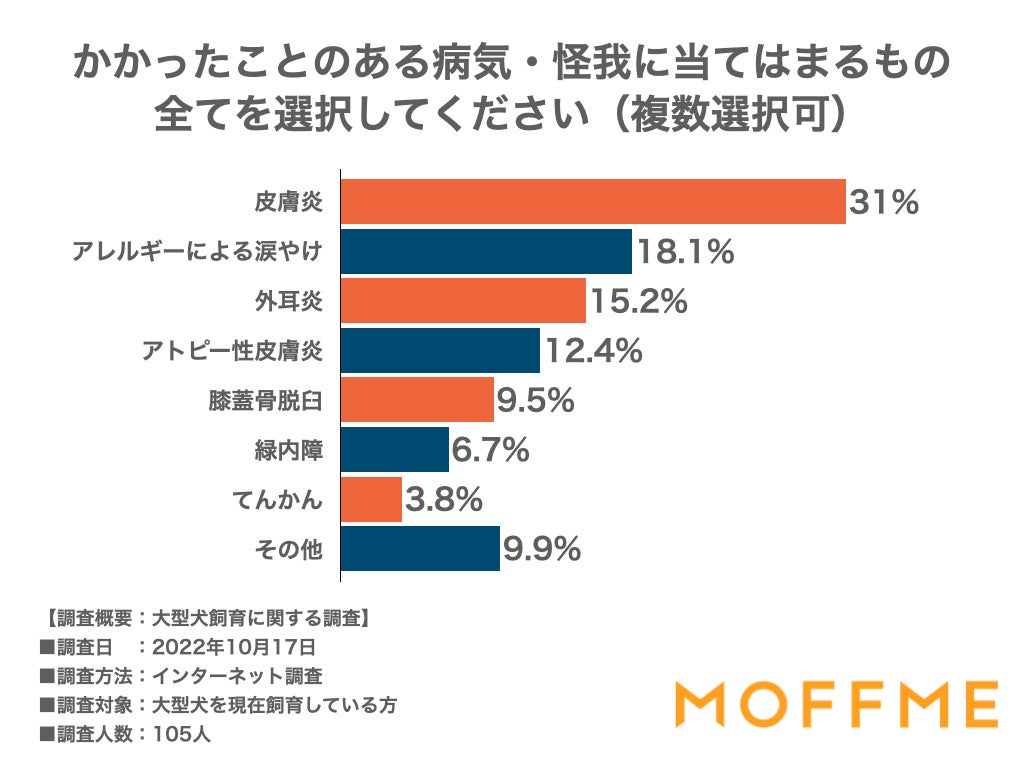 「皮膚炎」が31%、「アレルギーによる涙やけ」が18.1%、「外耳炎」が15.2%、「アトピー性皮膚炎」が12.4%、「膝蓋骨脱臼」が9.5%という結果となりました。