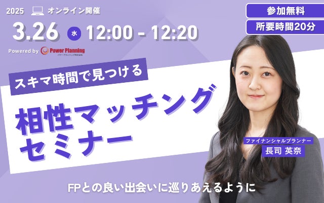 無料マネーセミナー提供サービス「アットセミナー」を運営しているパワープランニング株式会社が「3月26日(水) 12時」に「相性マッチングセミナー」というスキマ時間で自分に合ったFPを見つけられるオンラインセミナーを開催いたします。