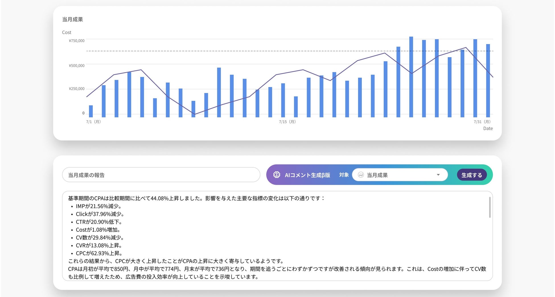 GPT-4等、LLM (大規模言語モデル)を含む各種AIを活用した、広告の運用実績の自動分析機能。自動分析機能は、運用実績からさまざまな数値的事実や因果関係を推察し、分析のアシストをおこなう。これにより、高精度でスピーディーな分析が可能となり、意思決定の量・質・スピードの向上につながる。