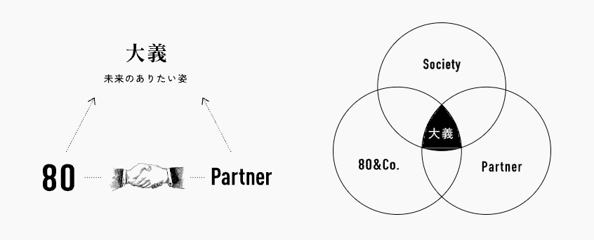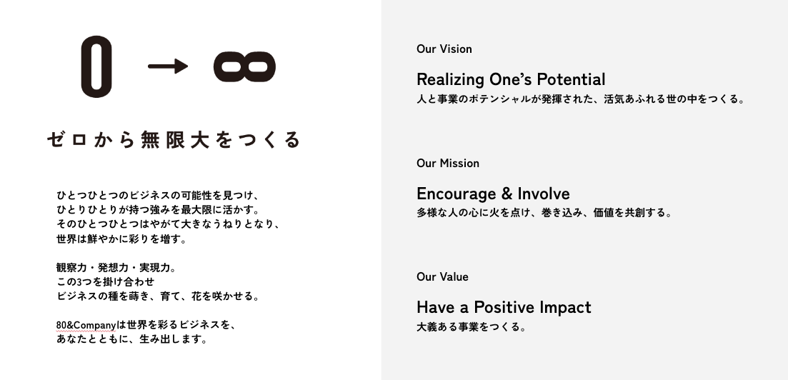 株式会社80&Companyは、人や事業のポテンシャルが発揮された活気あふれる世の中をつくることを目指し、多様な人の心に火を点け、巻き込み、価値を共創することをミッションとしています。