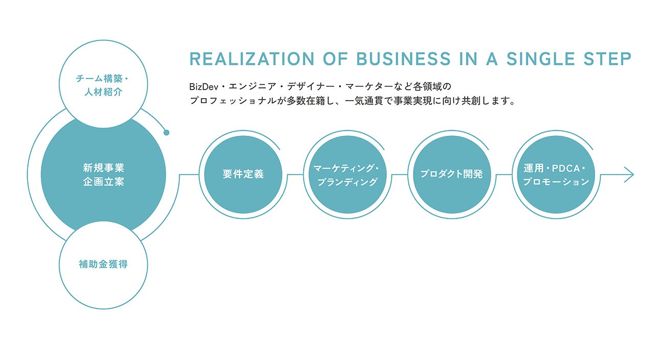 エンジニア・デザイナー・マーケターなど各領域のプロフェッショナルが多数在籍し、一気通貫でパートナー企業と描く大義の実現に向けて事業共創を行なっています。