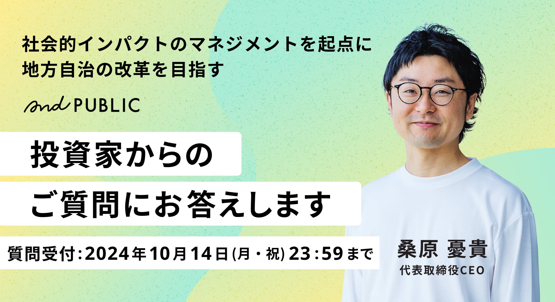 2024年10月14日(月・祝)23:59まで、投資家のみなさまより「アンドパブリック」へのご質問を受け付けます。投資家の皆さまからいただいたご質問への回答を、2024年10月16日(水)目途に募集ページ(https://ecrowd.co.jp/projects/43)へ掲載する予定です。