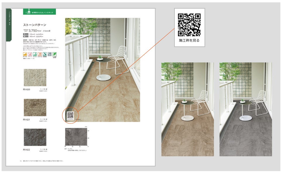 全商品にQRコードを設置し、見本帳に施工例写真が掲載されていない商品もWEBで施工例写真が確認できるようになりました。これにより、仕上がりのイメージがしやすく、ユーザーの商品選定をサポートします。