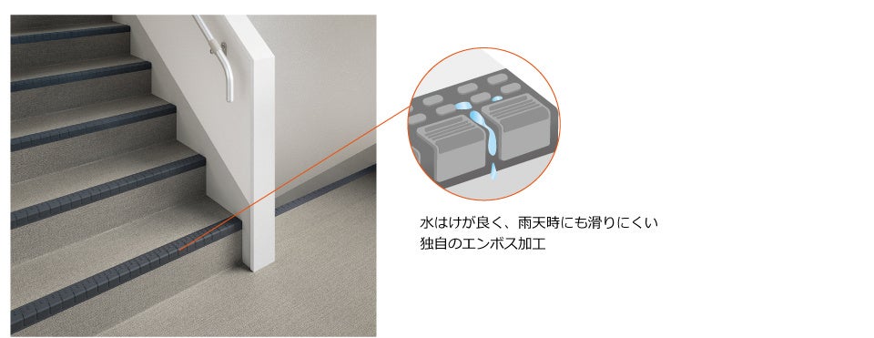 階段用の防滑性床材「ノンスキッド・ステップ」は、各種施設やマンションの共用階段の改修工事に使用されることが多い商品です。同見本帳では、ロングセラーの「ファブリック調Ⅱ」シリーズと同柄同色のノンスキッド・ステップを新たに収録しました。当商品は、独自に新開発した段鼻のエンボスにより、水はけがよく雨天時も防滑性に優れた、安全性の高い商品です。