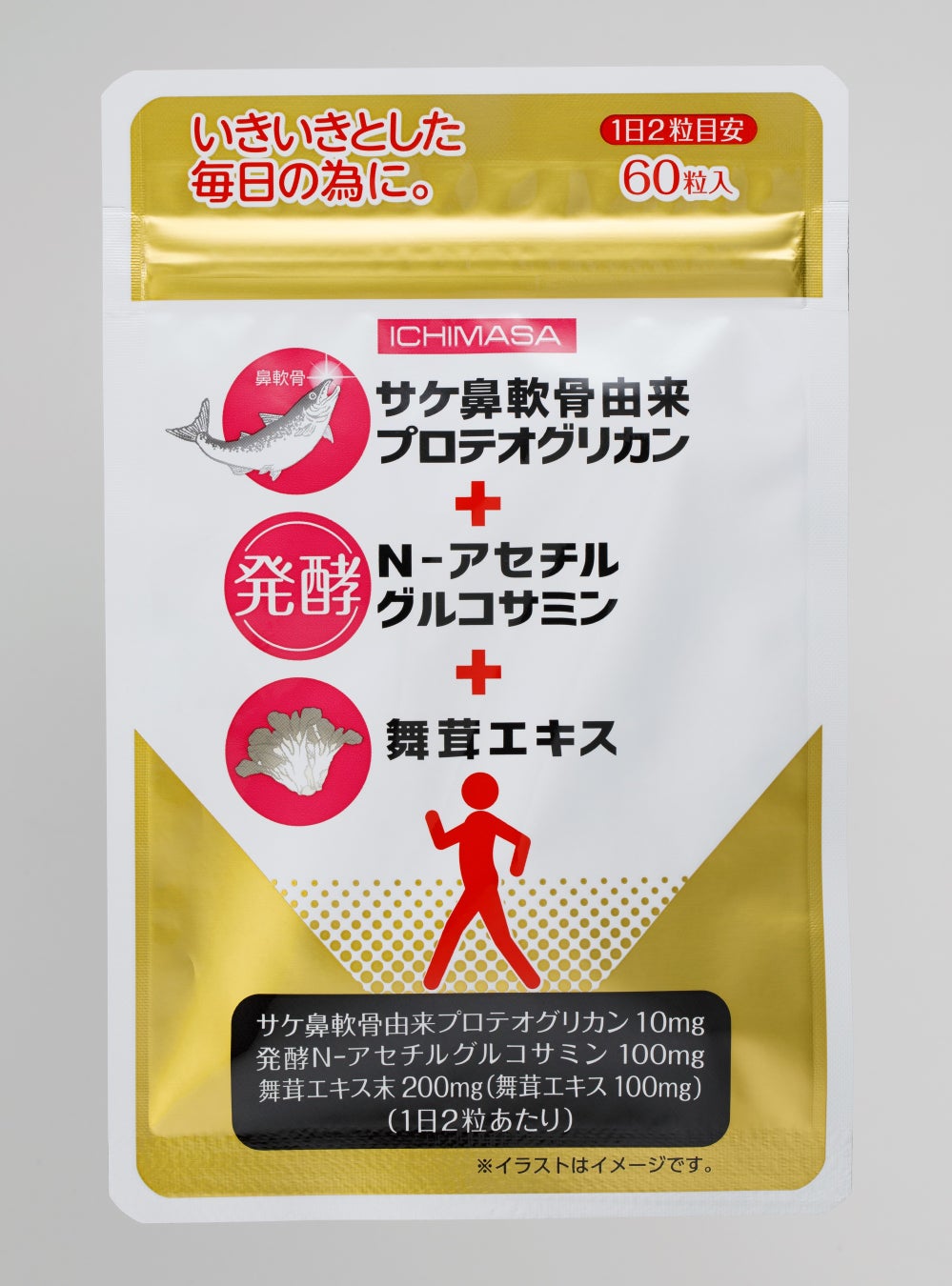 ・主な成分(2 粒あたり):サケ鼻軟骨由来プロテオグリカン 10mg、発酵N-アセチルグルコサミン 100mg、舞茸エキス末 200mg(舞茸エキス100mg)
