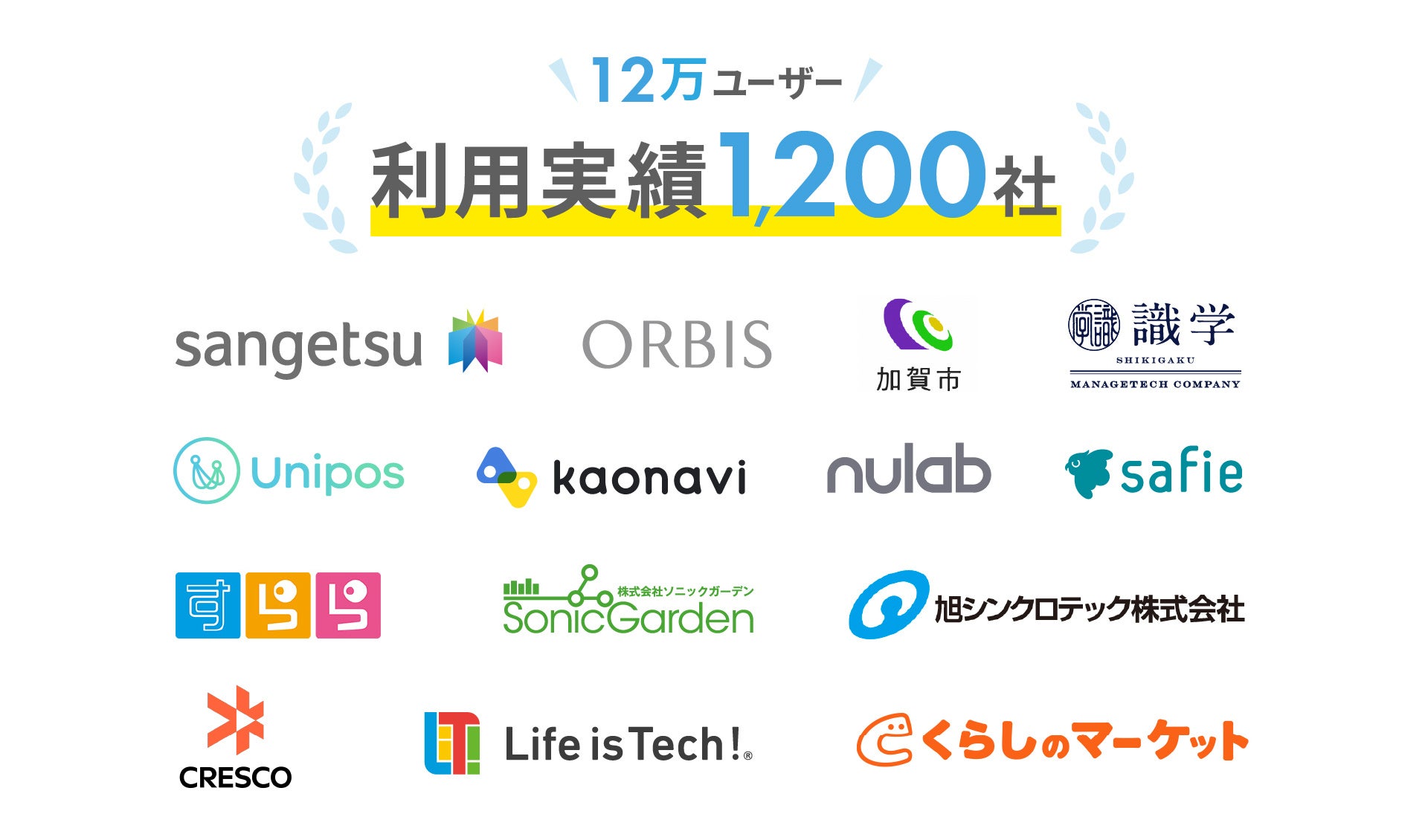 これまでに、8,000人以上の従業員を抱えるプライム市場上場企業、グロース市場にIPOを果たしたテクノロジー企業、ベンチャーキャピタルから数十億円の資金調達をしている未上場企業、創業から間もない数名〜10数名の規模の企業まで、累計1,200社導入および利用者12万ユーザー突破の実績があります。