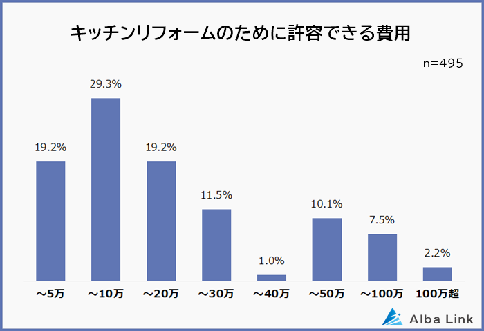 キッチンリフォームのために許容できる費用の平均値は約29万円。ボリュームゾーンは「5万円超10万円以下」となっています。
