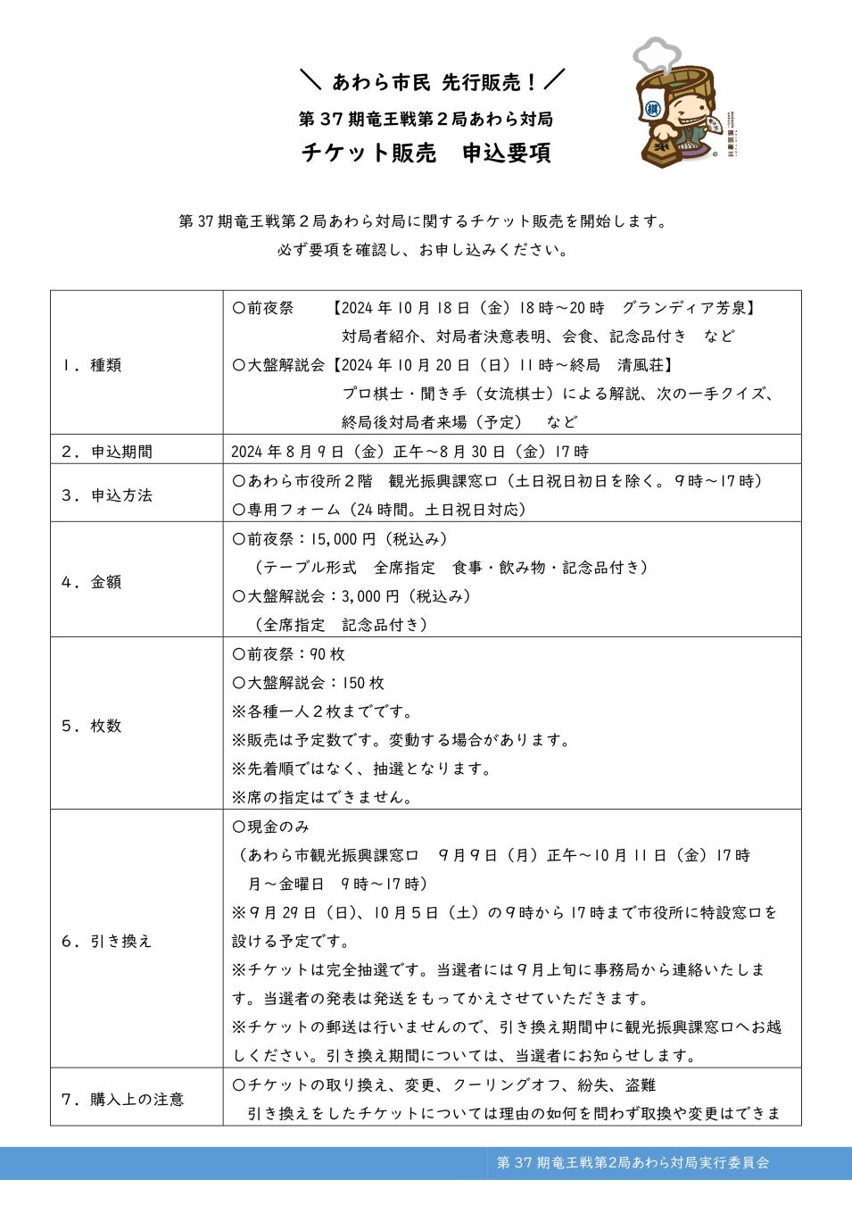 第37期竜王戦第2局あわら対局前夜祭、大盤解説会のチケット|あわら市民限定の先行申し込みは8/30まで!