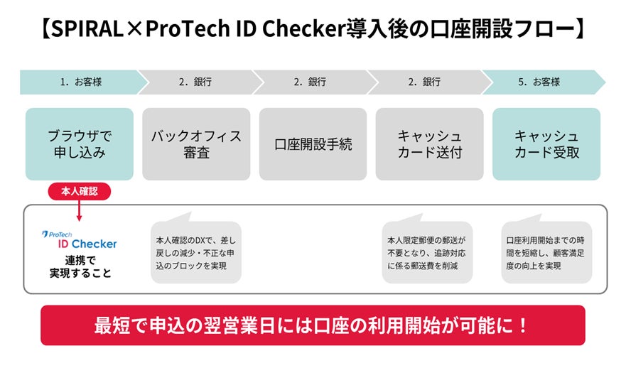 本人確認・住所確認が必要なタイミングで「ProTech ID Checker」が起動し、オンライン上にて本人確認手続きが完結します。口座開設においては最短で翌営業日の口座開設が可能となります。