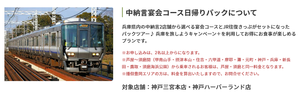 兵庫県内の中納言2店舗から選べる宴会コースとJR往復きっぷがセットになったパックツアー♪ 兵庫を旅しようキャンペーン+を利用してお得にお食事が楽しめるプランです。