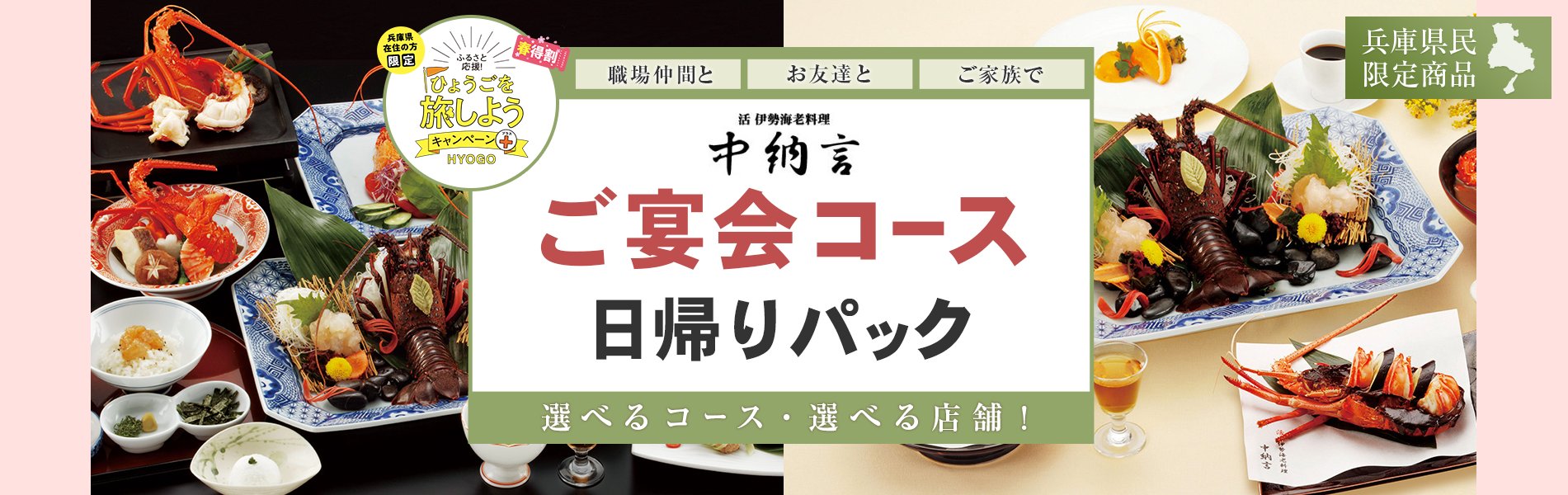 【5月31日迄延長!兵庫県民限定!】5,000円で「中納言」の伊勢海老料理とJR往復きっぷがセットになったパックツアー♪ ひょうごを旅しようキャンペーン+を利用してお得にお食事が楽しめるプランです。