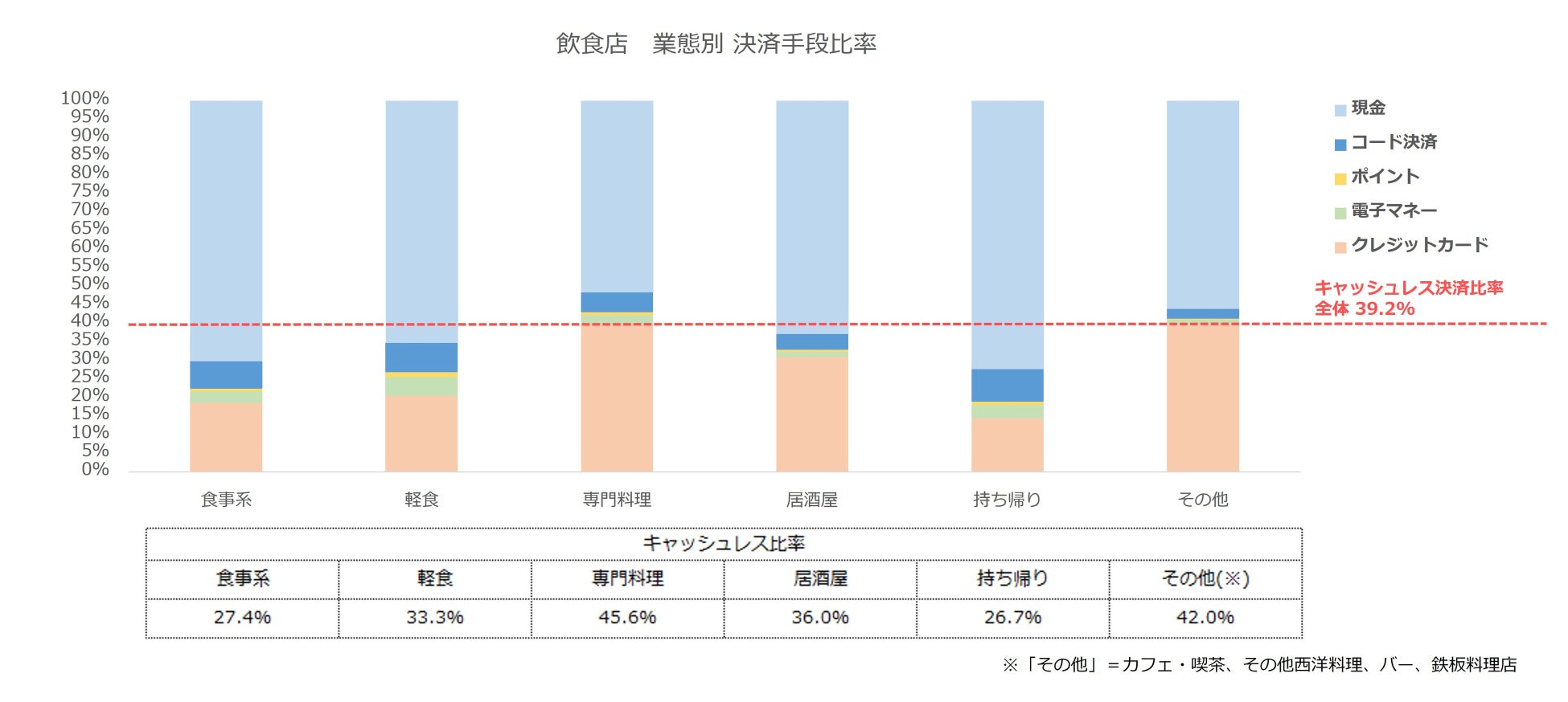 業態別に見ると、専門料理・その他でのキャッシュレス決済比率が高い。コード決済・電子マネーの使用比率は食事・軽食系・持ち帰り業態で高い。