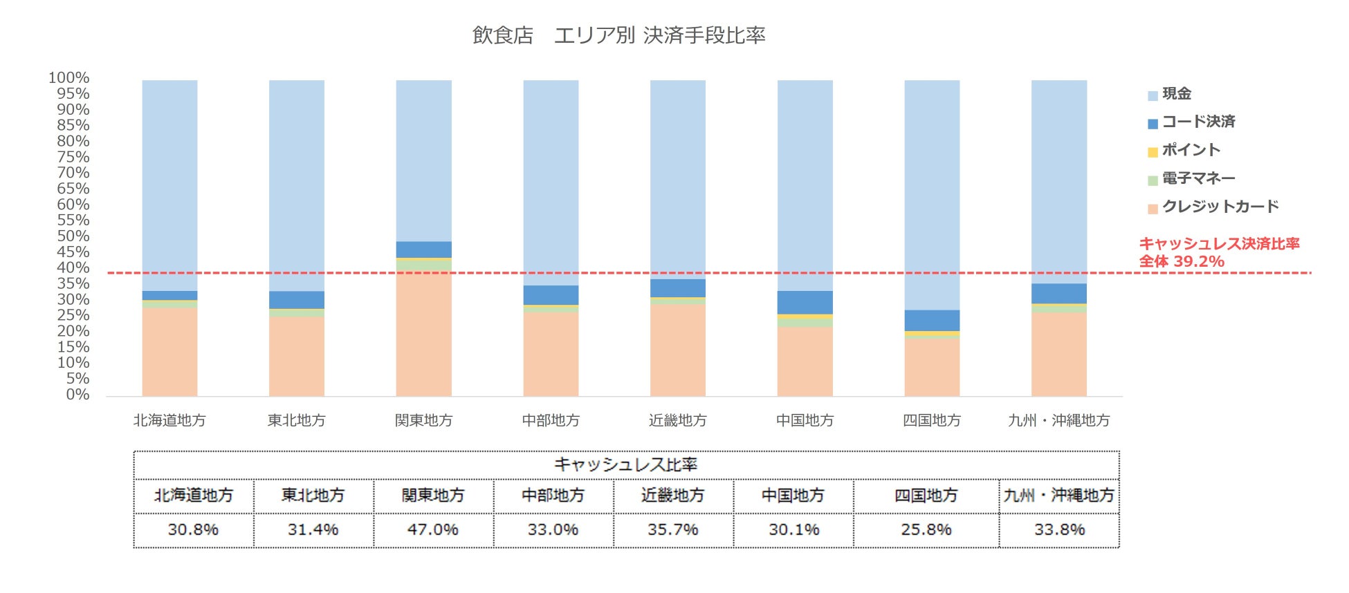 エリア別に見ると関東地方のキャッシュレス決済比率が47%と最も高く、そのうち8割がクレジットカード決済