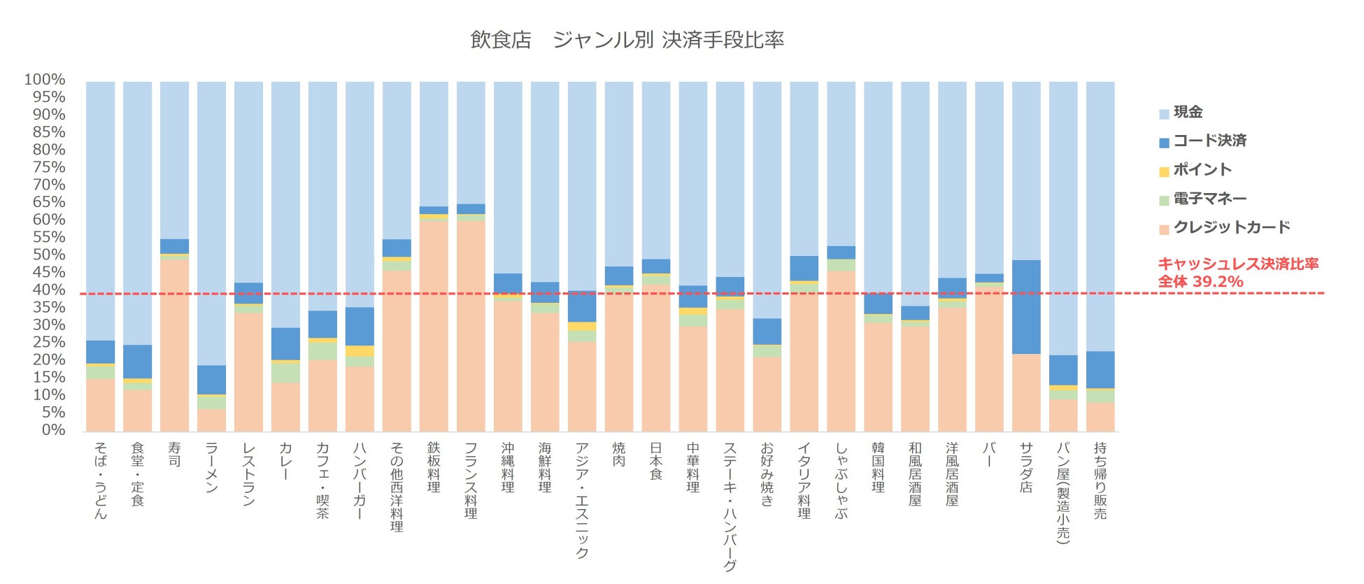 ジャンル別に見ると、鉄板料理・フランス料理・その他西洋料理・しゃぶしゃぶ、寿司等、比較的高単価の業態でのキャッシュレス決済比率が高い(そのほとんどはクレジットカード決済である)。キャッシュレス決済を100%として内訳を見ると、業態ごとの決済手段の違いが明確にわかる。ハンバーガー・カレー・ラーメン・そば・うどん等の軽食/食事系は前頁の通り現金比率が高いものの、キャッシュレス決済の中ではコード決済比率が高い。