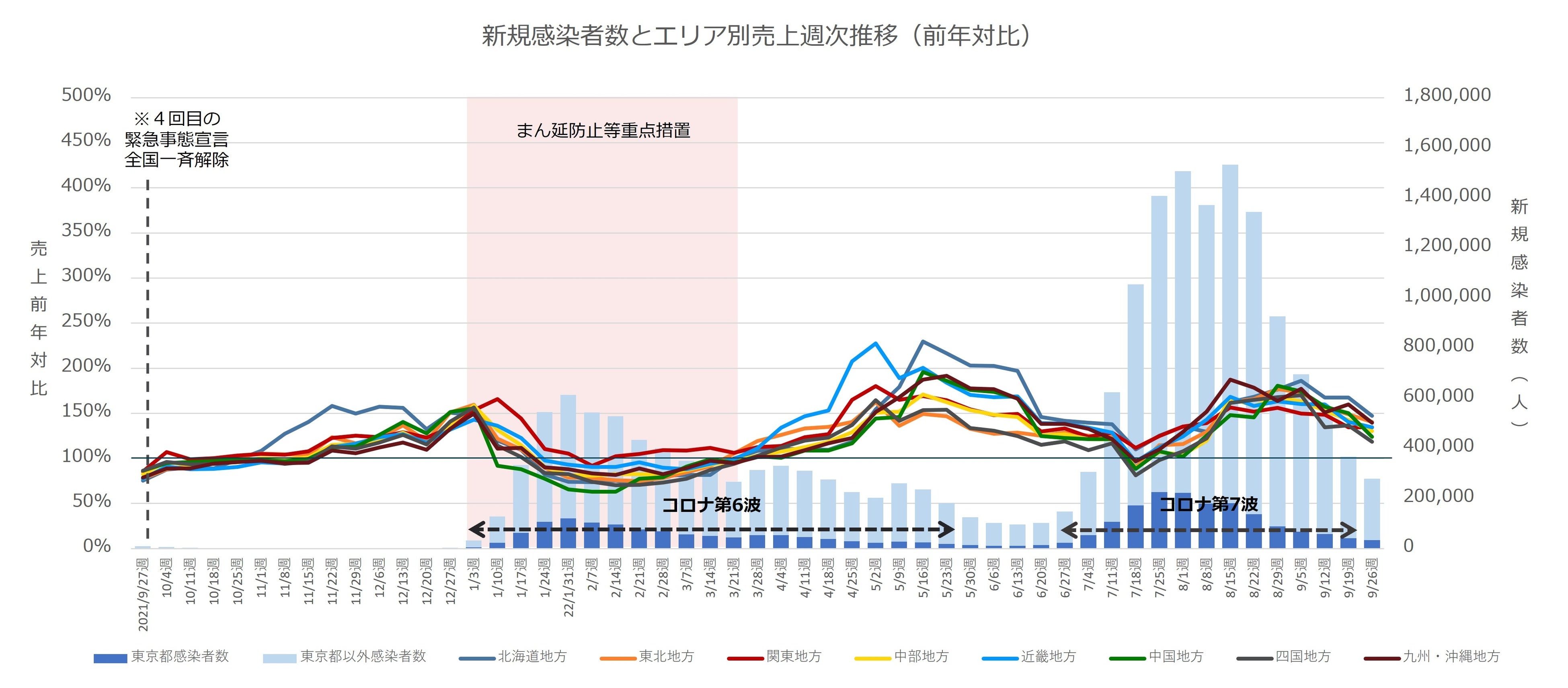 集計内容:飲食店 売上月次推移(前年対比)、新規感染者数とエリア別売上週次推移(前年対比)