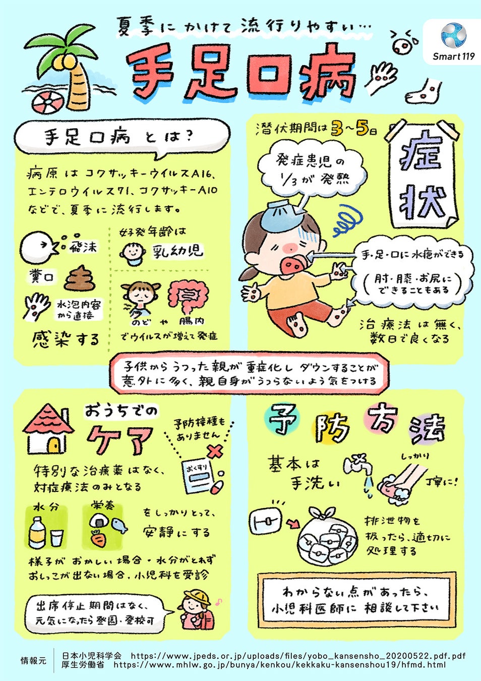 千葉大学発医療スタートアップ企業である株式会社Smart119(本社:千葉県千葉市、代表取締役社長/CEO:中田孝明)は、手足口病についてのイラストレーションを本日一般公開しました。夏に流行する手足口病は、子どもがかかりやすく、特別な治療薬がない病気です。また、大人が感染した場合には、重篤化する傾向があります。子どもが活発になる夏を健やかに過ごすために、症状、治療方法、予防方法のポイントを親しみやすいマンガで解説します。本資料は学校、企業、公共機関、町内会等で自由に配布・利用していただくことが可能です。
