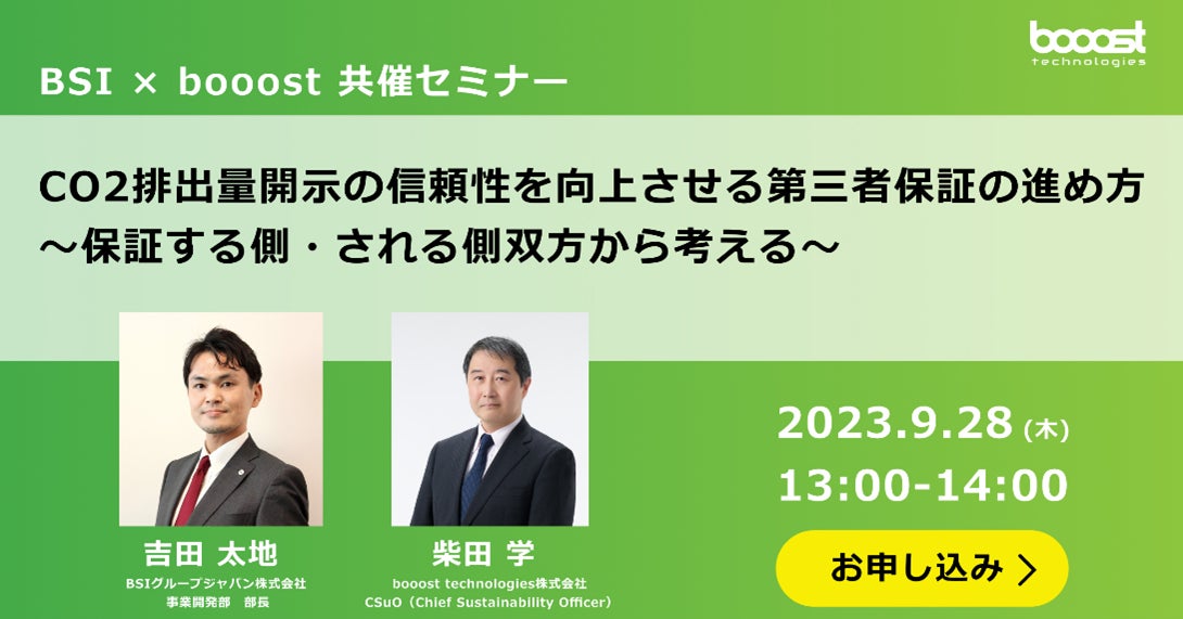 そこで、本セミナーでは、BSIグループジャパン様をお招きし、国際認証におけるCO2排出量開示の国際規格や第三者評価とはどういったものなのか、世界や日本の動向はどうなのかについて解説していただきます。その他、対談セッションやCO2排出量可視化プラットフォーム「booost GX」の紹介も行います。ぜひご参加ください。