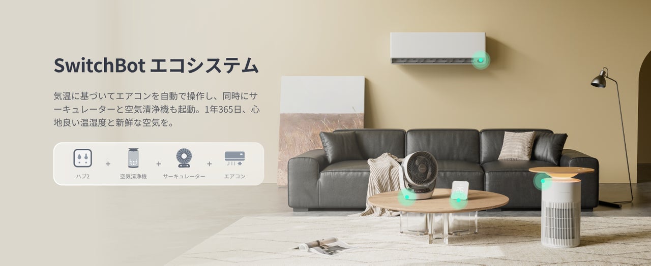同社ハブ製品やサーキュレーター、加湿器などと併用すれば、まるっとおまかせするだけで、お部屋の空気をいつでも自動で快適に保ちます。