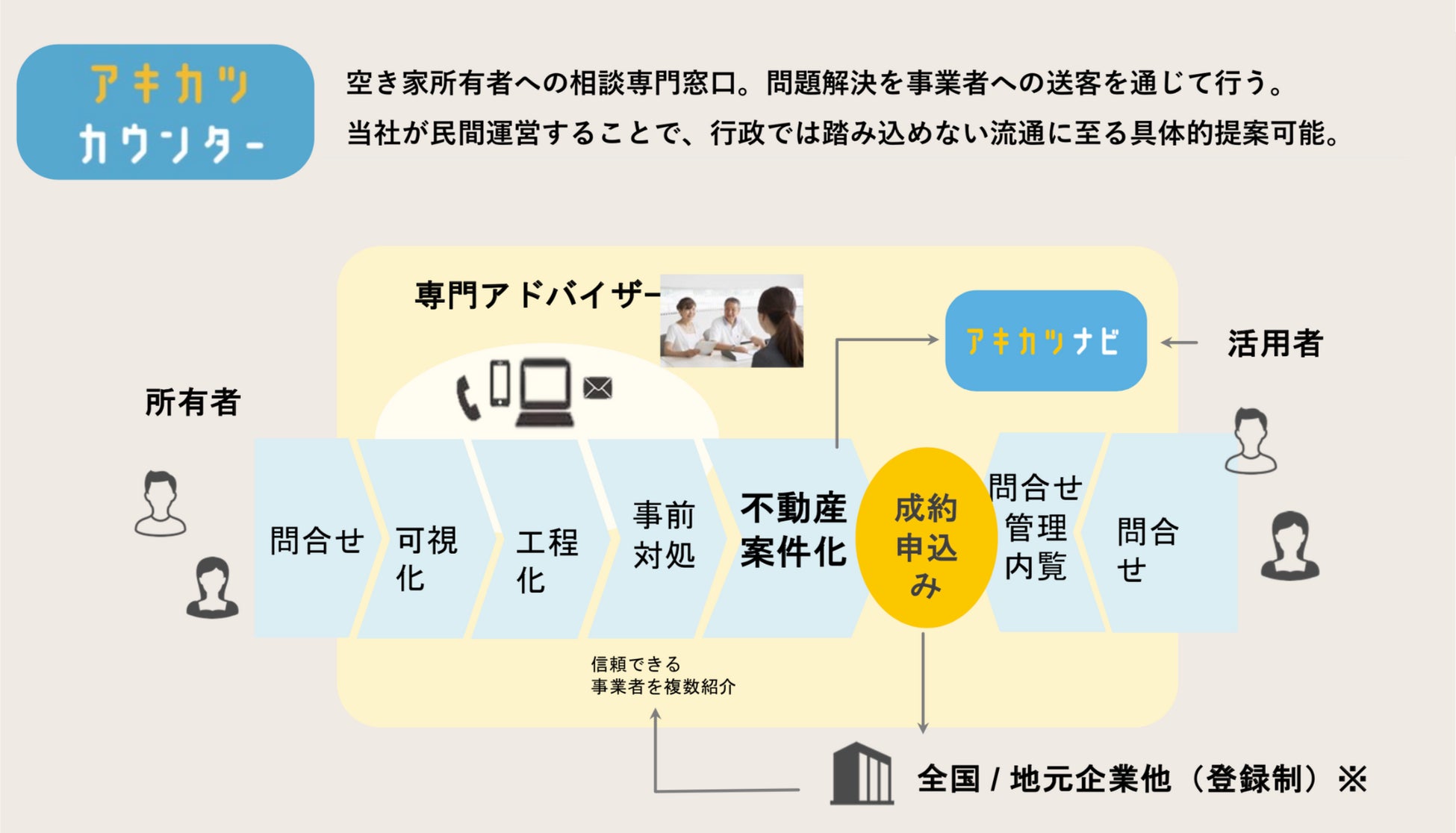 (※)成約時のみ運営委託会社である空き家活用株式会社に手数料が発生する仕組みです。