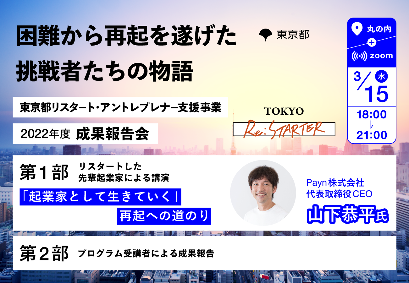 【東京都主催】困難に直面した起業家の再挑戦支援プログラムの成果報告会を2023年3月15日(水)に開催