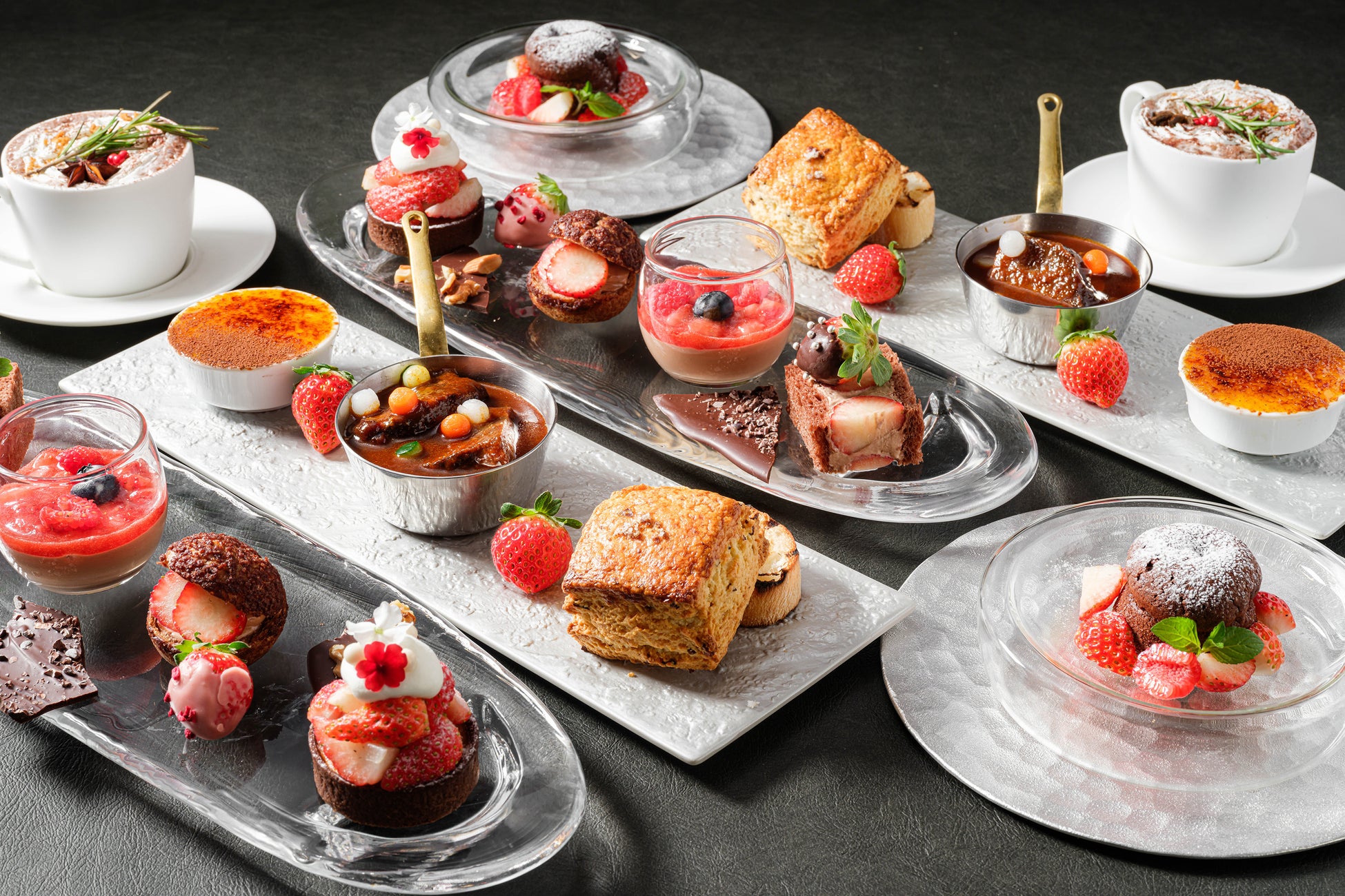 スイーツはムース、シュークリーム、タルト、苺チョコサンドなど、チョコレートのビター&スイートな味わいに苺のフレッシュ感をアクセントにしたセレクションをご用意。しっとりとした生地から濃厚なチョコレートがとろけだすフォンダンショコラも見逃せません。そして、シェフ特製のセイボリープレートには、赤ワインとチョコレートで煮込んだ牛頬肉、カカオ風味をアクセントにした白レバームースのキャラメリゼ、焼き立てのカカオスコーンなどが揃い、ワインやシャンパンとのマリアージュもおすすめのラインアップです。