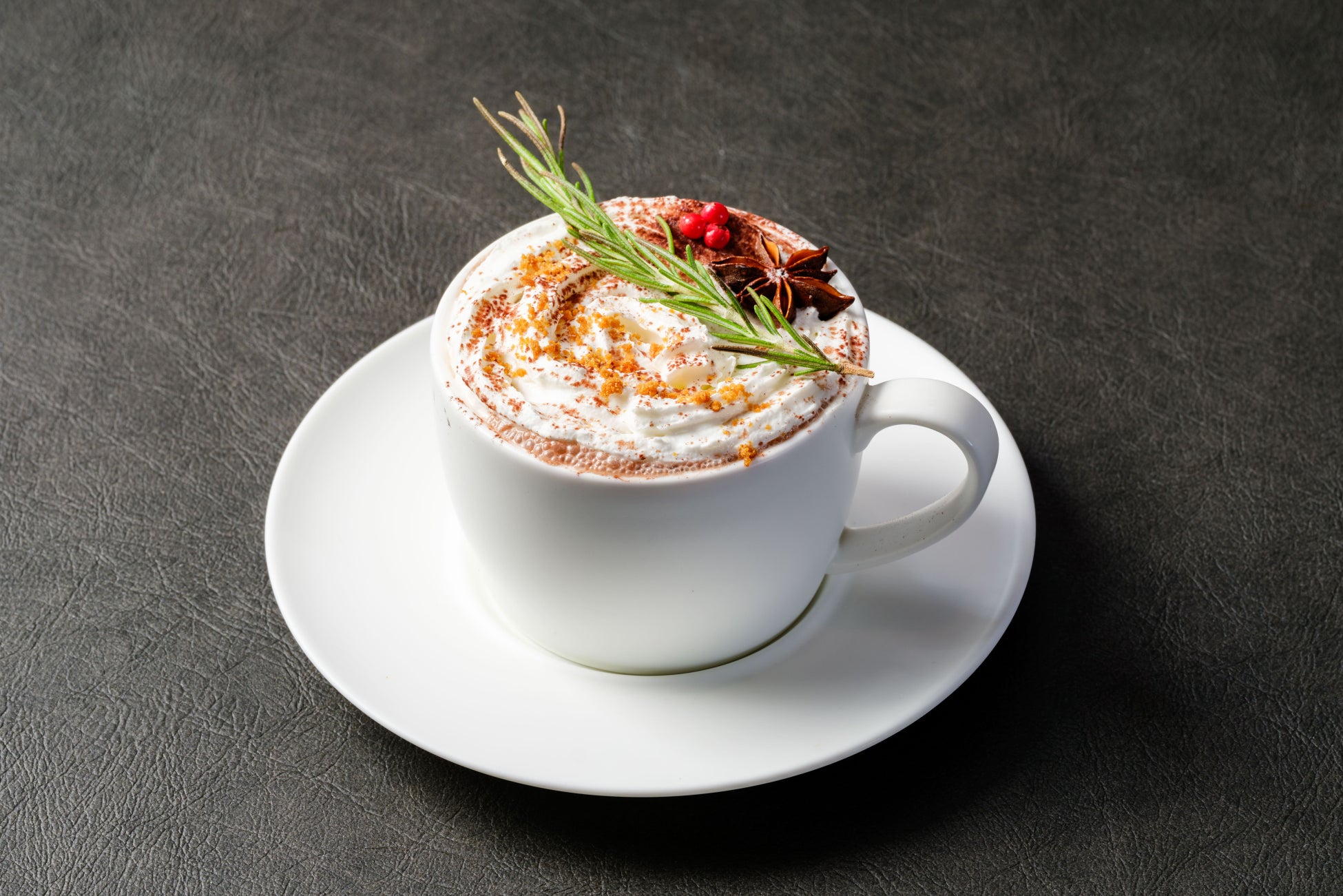 深みのあるココアに数種類のスパイスをブレンドし、香り豊かでやさしい甘さに仕上げたホットチョコレート。雪に見立てたホワイトチョコレートをトッピング。