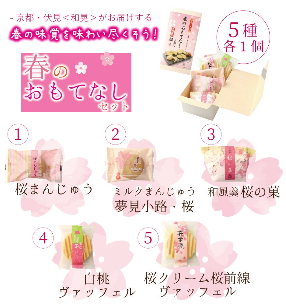 春にしか味わえない和菓子セットが登場!桜ピンクが可愛らしいお菓子が5種類つまってます。