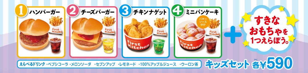 ウェンディーズとファーストキッチンでは、お好きなおもちゃが選べる、4種類のキッズセットを 590円にて販売しております。セットに付いてくるポテトSサイズは、プラス90円でMサイズに変更いただけるほか、無料でお味の選べるフレーバーポテトにも変更できます。