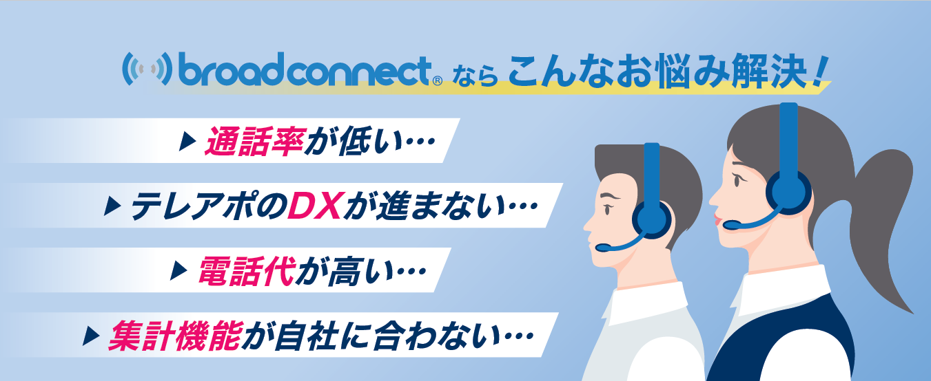 「ブロードコネクト」はアウトバウンドに特化したコールシステムです。IP回線と携帯回線を併用することで、繋がり率UP&コスト削減を可能にしたハイブリットCTIです。業界初※の勤務時間からテレアポ生産性をレポートで自動集計する機能を搭載しています。(※2023年9月 当社調べ)