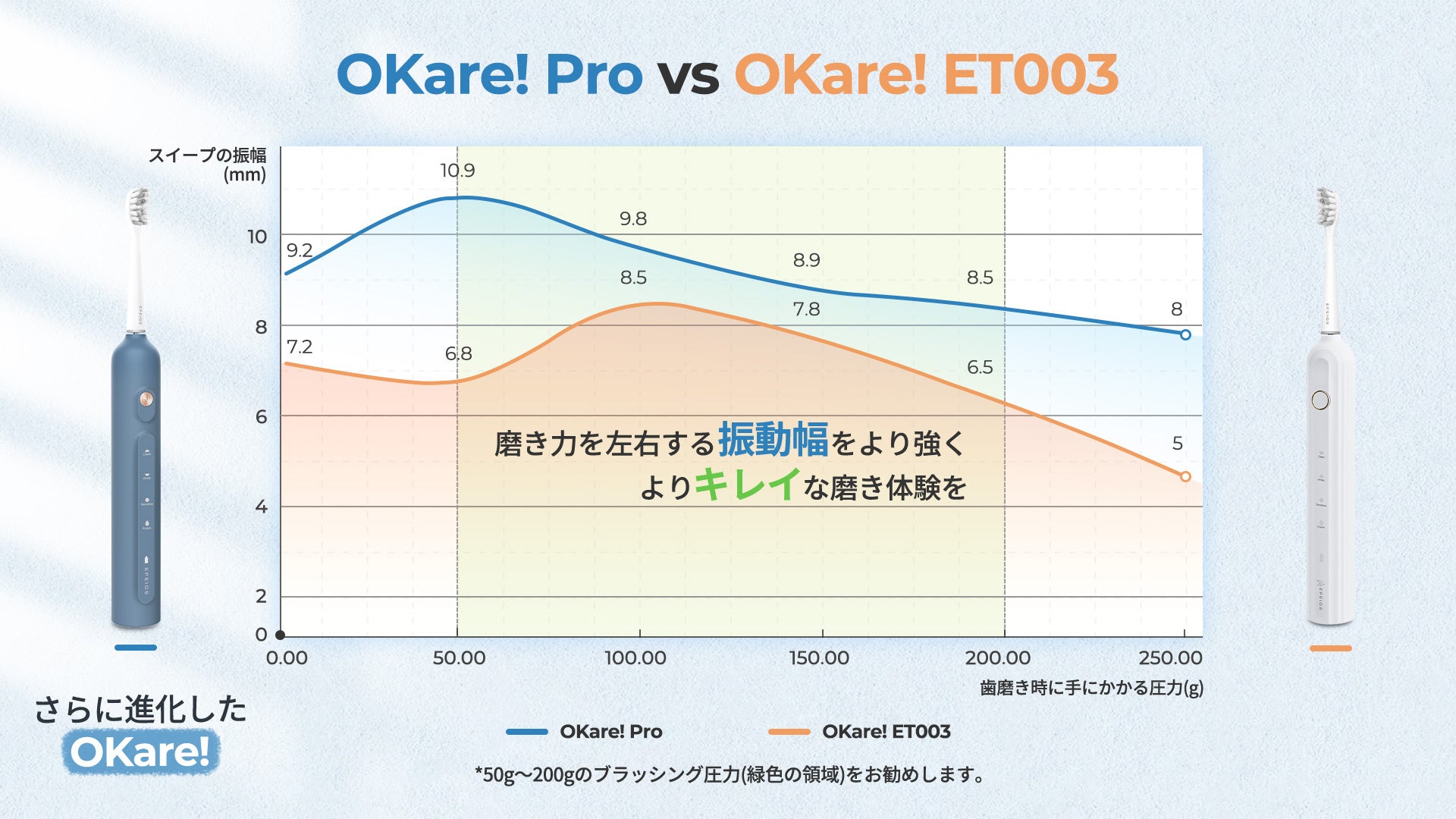 新モデル「Okare!PRO」は、それぞれ異なるブラッシング圧でも、既存モデルに比べ振動幅が抑制されにくく、安定的にパワフルにかつ繊細に振動させることで、歯垢の落としやすさと磨き心地をアップ!既存モデルより振動幅を平均で約30%アップ(ブラッシング推奨圧50g~200g/*自社調べ)したことで、より安定的なブラッシング効果を発揮し歯間や歯茎の汚れをやさしく落とします。