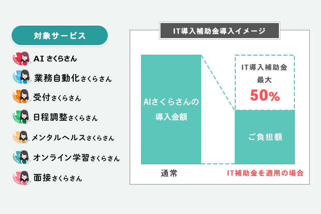 これにより、補助対象となる中小企業や小規模事業者の方は、AIさくらさんを導入・運用する際にかかる費用の最大50%が補助金として交付されます。