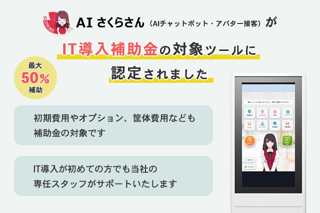 これにより、AIさくらさんの導入・運用にかかる費用のうち、最大で50%(150万円まで)の補助を受けることが可能となり、「AI導入に興味はあるが費用面がハードルとなっている」と考える事業者に対して、導入・活用していただきやすい環境が整いました。