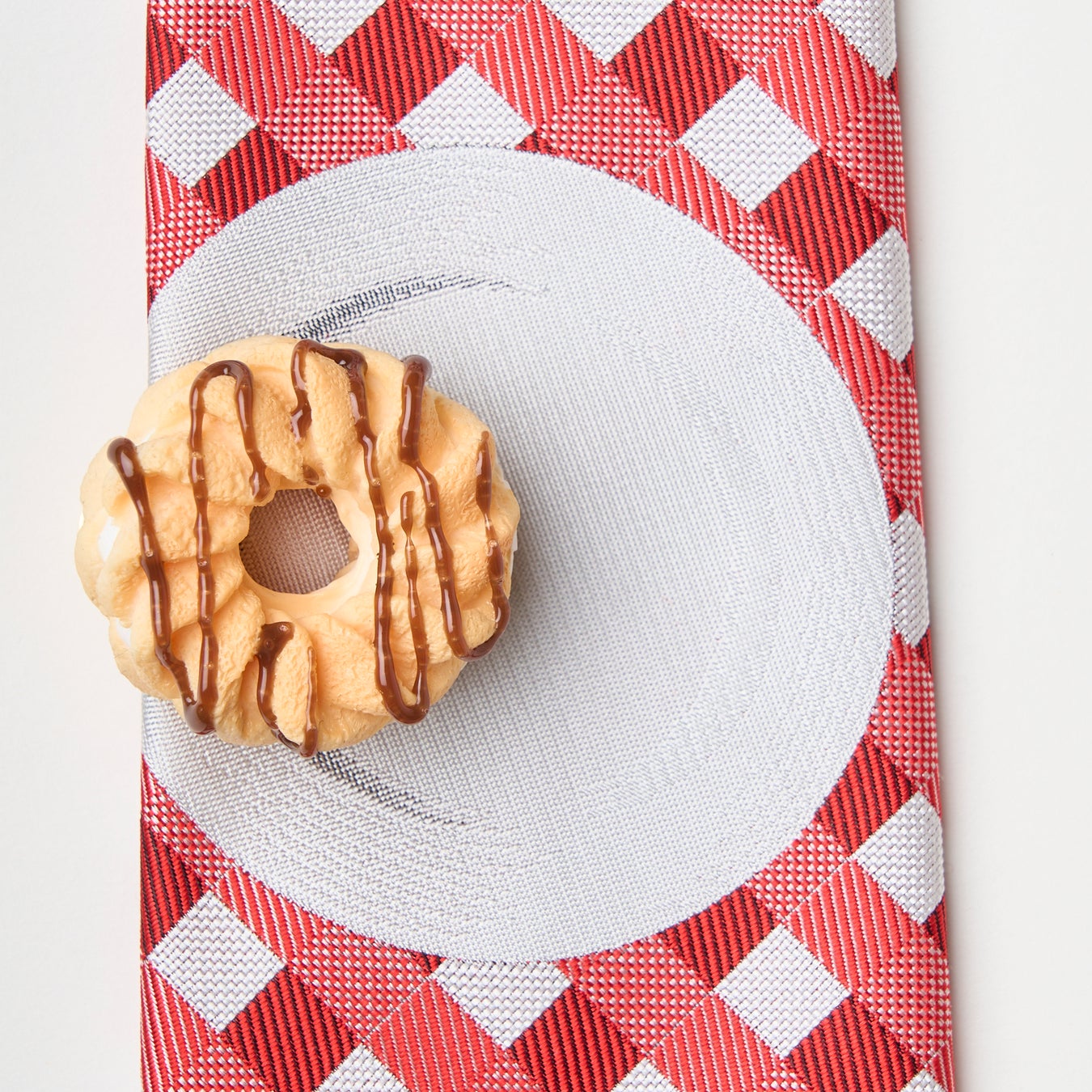 ドーナツのネクタイピンがポイントの「TREAT MEタイ(フレンチクルーラー)」「TREAT MEタイ(ドーナツ)」。テーブルクロスの上のお皿が織りで胸元に表現されたネクタイに、おいしそうなドーナツのネクタイピンを着けて、セットでお楽しみいただけます。