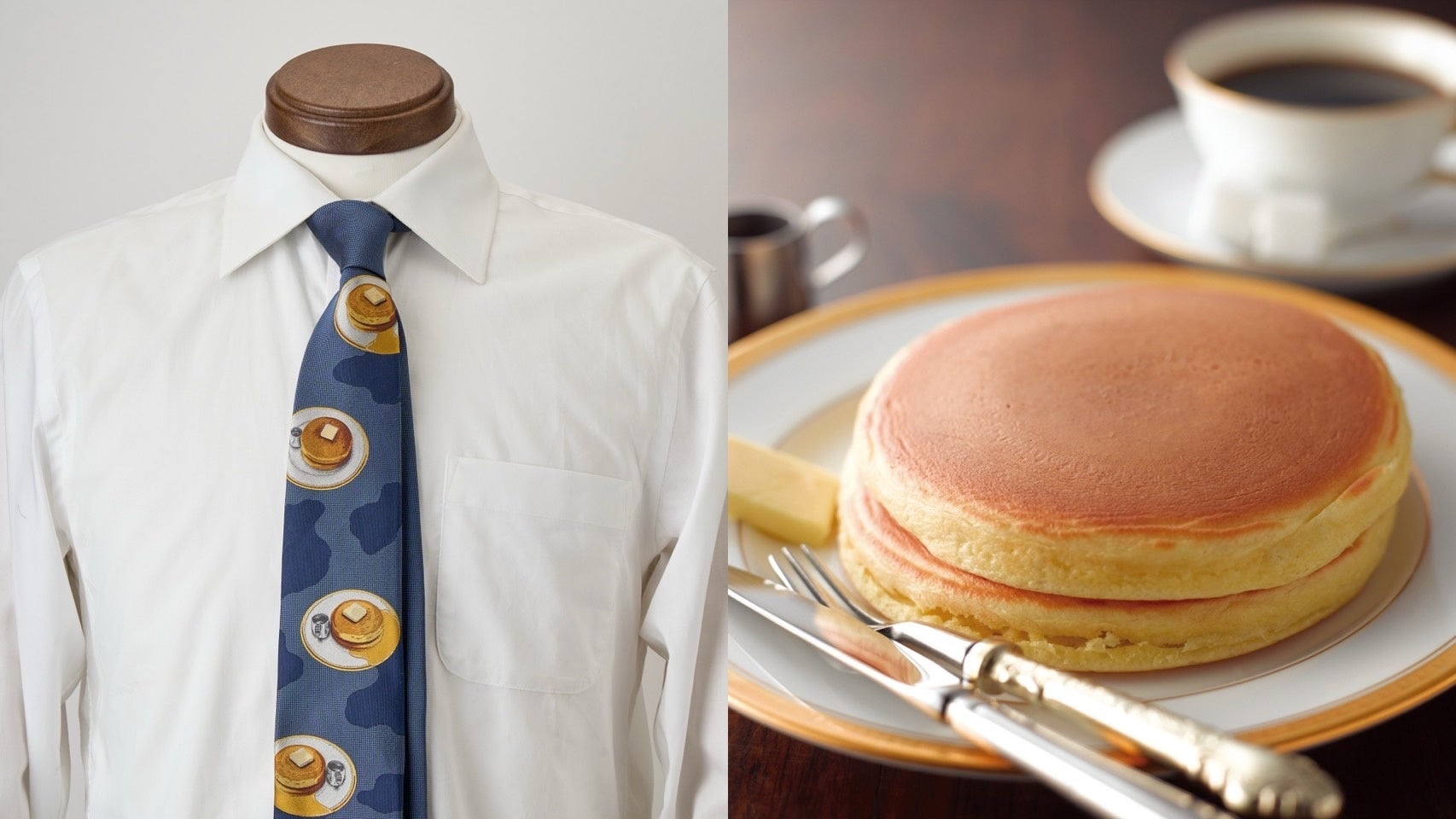 コレクションのラインナップには、大阪・千日前に本店を構える「丸福珈琲店」とのコラボレーションアイテムも加わります。丸福珈琲店は、2025年に創業90周年を迎える老舗喫茶店。2023年の父の日に、直営店での共同企画を行った縁で、90周年の記念アイテムとして、丸福珈琲店のアイコニックなアイテムをデザインに落とし込んだ2種類のネクタイを制作。